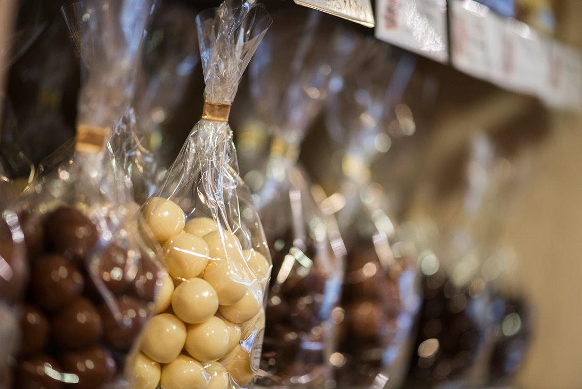 Außerdem gibt es in unserem Geschäft viele verschiedene schokolierte Früchte und dragierte Nussspezialitäten.